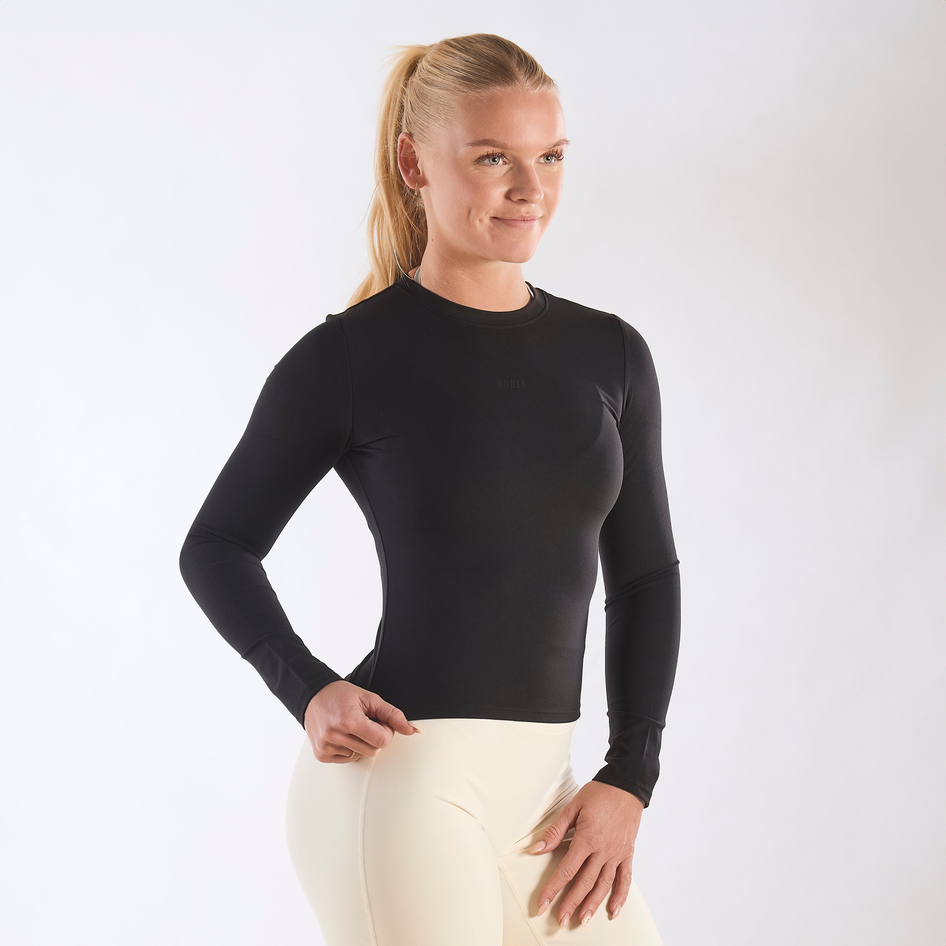 Aura Long Sleeve er vævet i et blødt, børstet stof med let stretch, der giver en smooth, formende pasform og en “second skin”-følelse.